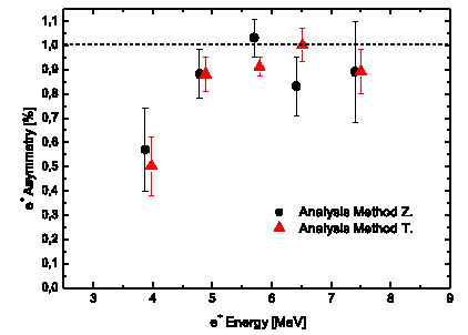 Both photon and positron asymmetries have been analyzed for different energies. Two independent and different approaches (methods `T' and `Z') for the data analysis have been used and show consistent results: The photon (positron) asymmetry is in the expected range of about 3.4% (0.5% - 1%). To derive the polarization from the measured asymmetry, the analyzing power has to be determined. Preliminary results give a positron polarization between 50%-90%, depending on the different energies. Final results are under work. |
