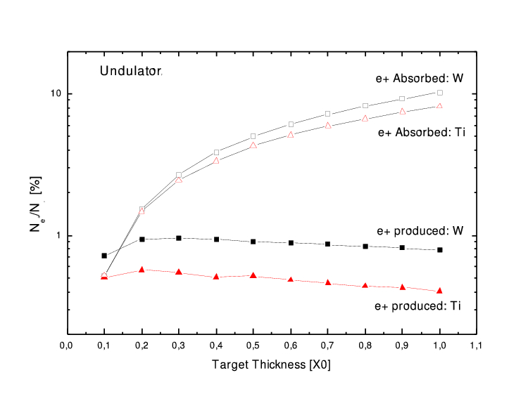 The incoming 10^10 electrons per bunch were leading to about 10^9 photons per bunch. The conversion into positrons at the W target is about 1% in that photon energy range of about 10 MeV (linked plot shown for a GEANT4 simulation with a first harmonic cutoff of 9.6 MeV. More details are given in this talk). |