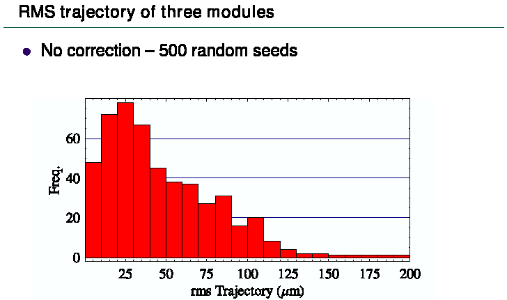 500 simulations of electron trajectories through 12 m of the undulator (3 modules) with random errors of about 5% in the peaks (i.e. errors assumed to be about 3-5 times worse than in the measured device) have been made. The results derived without applying any corrector magnets, show that the average rms electron trajectory is less than 50 microns, which is far below the before mentioned 500 micron range. Given the size of the rms trajectory with realistic errors the electron orbit through the undulator is not a crucial issue. No corrector magnets are absolutely needed. More details are given in this talk. |