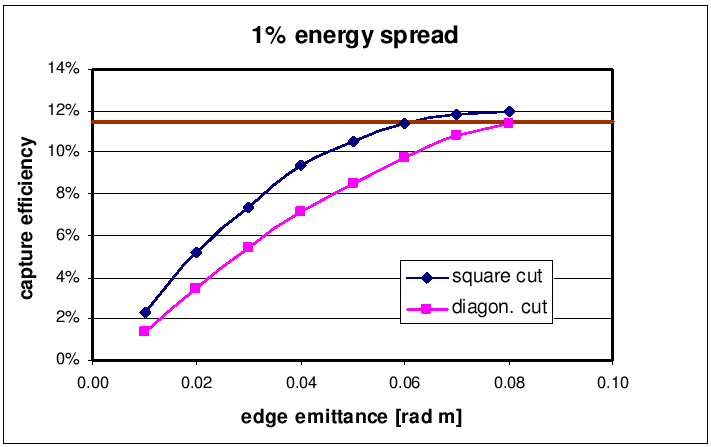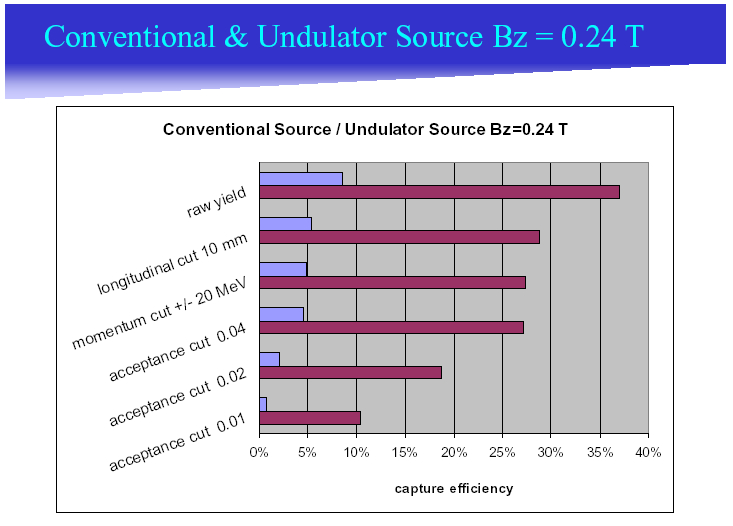 It is therefore expected that all three sources can match the acceptance. However, the conventional source has only a small safety margin, as shown in the EUROTeV report and demonstrated in this plot for the conventional source, where the dark line marks the effciency needed to fulfill the yield requirement of 1.5. The comparison of the capture efficiencies of the sources shows that the conventional source is expected to have a lower capture efficiency by about a factor 5 at the end of the AMD.