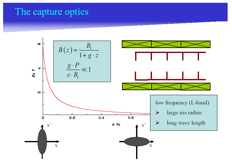 To achieve the required acceptance of the damping ring and achieve the best total capture efficiency, an adiabatic matching device (AMD) is used, starting with a magnetic field B_z=6 T that is reduced adiabatically down to a field of about 0.5 T. More details about the needed capture optics are given in this talk. The taper parameter for the undulator source has been chosen to be g=30 m^-1 and for the conventional source g=60 m^-1. |