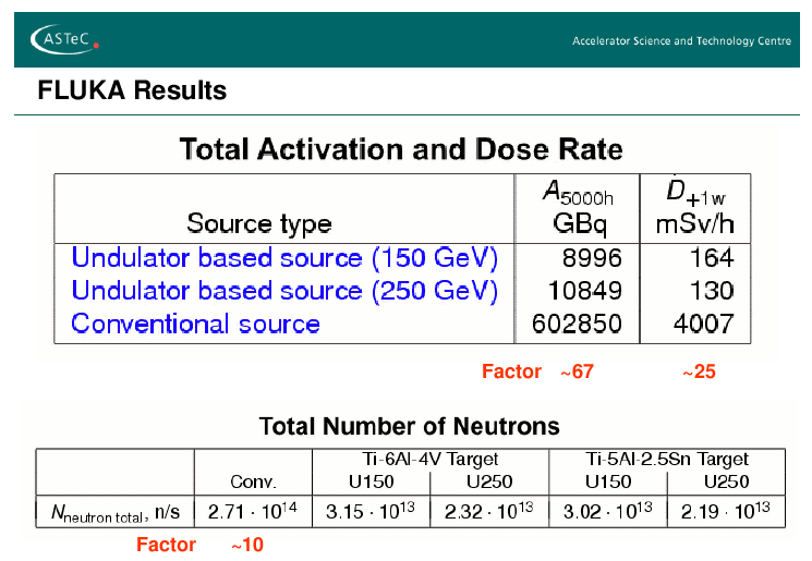 The rate of the neutron production is a factor 8.6 higher for a conventional source than for an undulator-based source at 150 GeV and even more than a factor 10 compared to an undulator source at 250 GeV. The activation and dose rates are composed by contributions from the target, AMD, collimation and solenoid regions. The total resulting activation level after 5000 hours of operation of the conventional source is about a factor 67 higher than that of the undulator-based source (150 GeV). This leads to an higher dose rate (after 5000 h of operation followed by one week of shut down) by about a factor 25 of the conventional source compared with that of the undulator source. More details about the radiation aspect of the sources are described in this EPAC06 contribution. |
