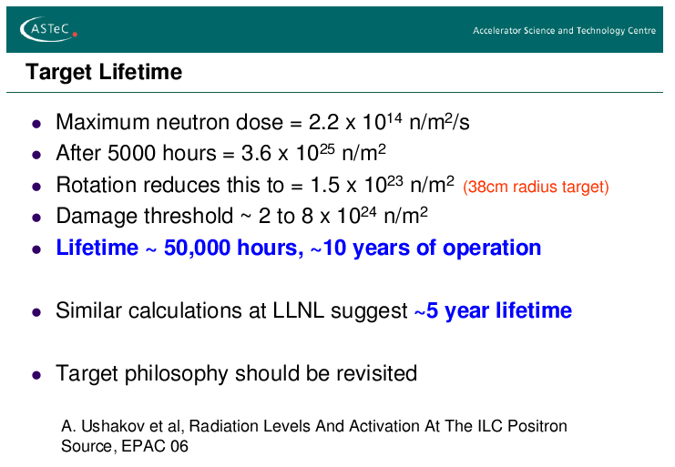 The maximal acceptable neutron fluxes that does not result in significant changes of the mechanical properties of the Ti-alloy target is in the range of (2-8)10^24 n/m^2. Such a flux is approximately achieved after 50000 h of operation, i.e. in about 10 years. More details are given in this talk. |