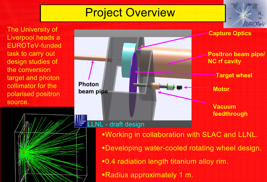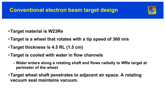 In order to get the thermal stress under control the target has to be rotated with a tip speed of about 360 m/s. Water cooling is needed for the rotating wheel. More details about such a possible design are given in this talk. |