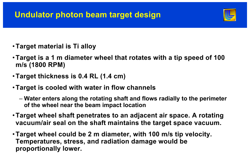 In the current ILC undulator target design even a wheel with a diameter of 2 m with a tip speed of 100 m/s is foreseen. Such a decrease in rotation speed to about 1000 RPM results further in a proportionally lower target stress and radiation damage. Further details of this current undulator target design are given in this talk and are described in this EPAC06 contribution. |