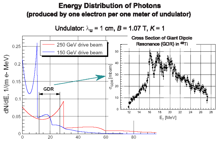 The number of produced neutrons depends on the photon energy in the target. The maximum peaks are given for of photon energy range between 15-19 MeV (right plot). To fix the optimal drive beam energy of an undulator, that resultes in less produced neutrons, one has to calculate the energy position of the first harmonics of the undulator radiation: for the chosen undulator parameters at about 10 MeV (for 150 GeV) and at about 30 MeV (for 250 GeV), (left plot). More details are given in this talk.
